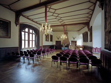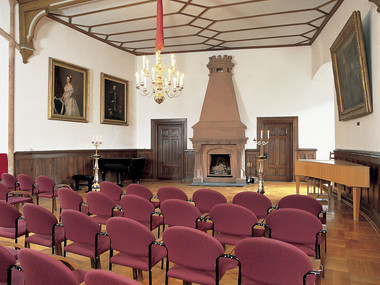 Maximal 99 Personen (in Sitzreihen) bzw. 80 Personen (Bankettbestuhlung) finden im Großen Festsaal Platz.