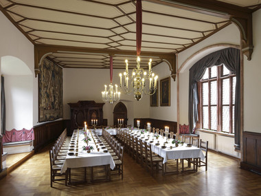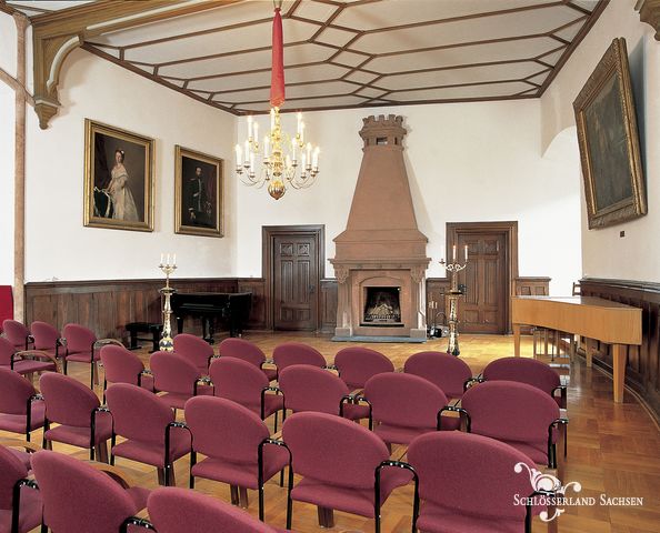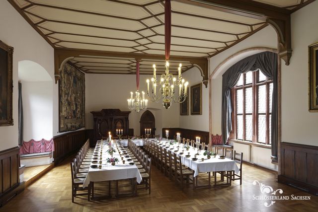 Der große Festsaal der Burg Kriebstein wurde im 15. Jahrhundert unter der Herrschaft von Schleinitz erbaut und bietet ein festliches Ambiente für Trauungen und Feierlichkeiten. Die komplette Ausstattung mit Gardinen, Gemälden, Steinway-Flügel und Kamin bildet eine würdevolle Umrahmung Ihrer Hochzeit.